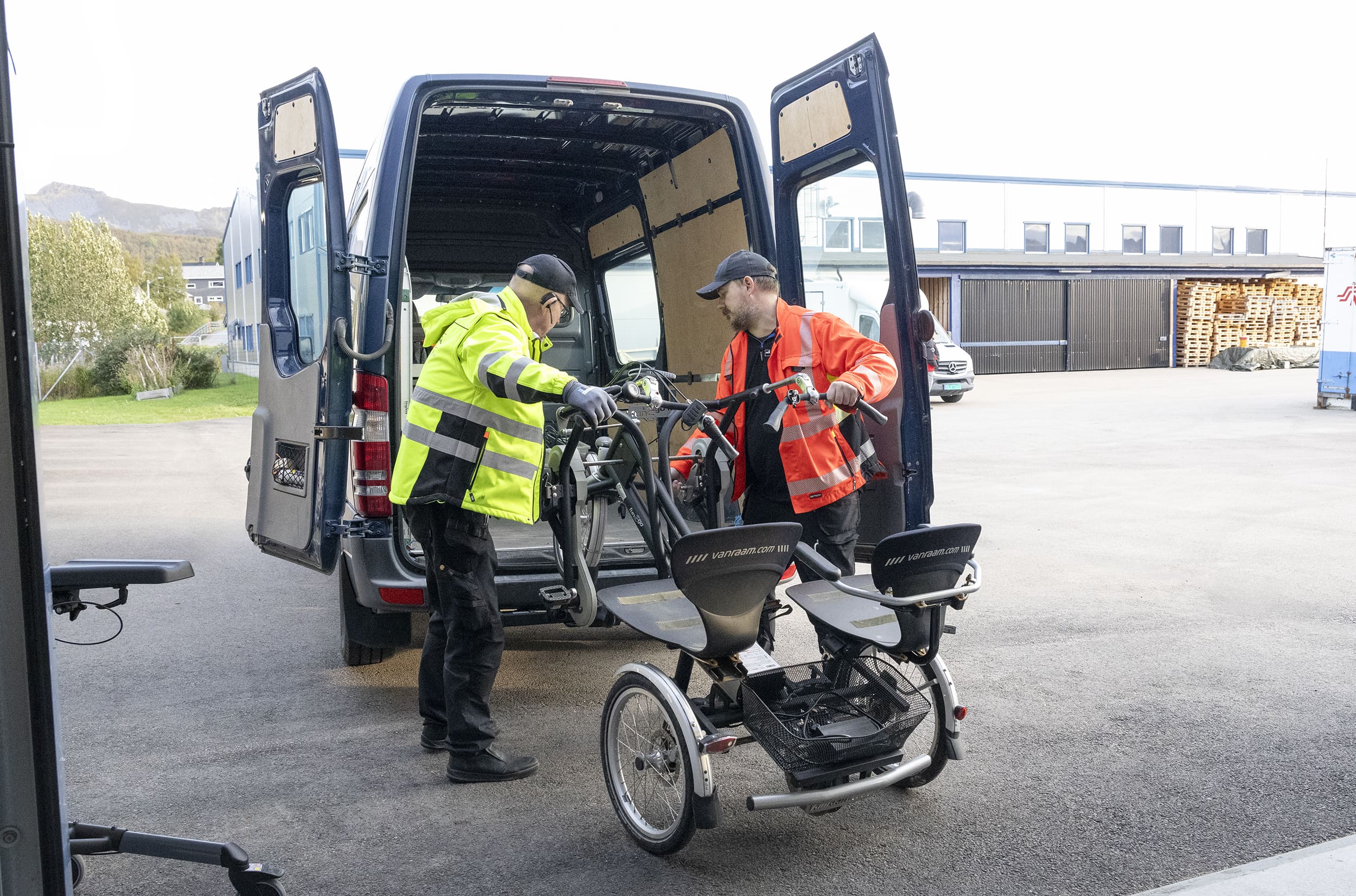 Sammen med kollegene sine begynner han å fjerne bobleplast og ser over at det ikke har vært skader på sykkelen under transport. Deretter laster de sykkelen opp i bilen, stropper den fast og kjører hjem til brukeren. De vet brukeren lengter etter sykkelturer og at de kommer til å bli møtt med store smil når de laster sykkelen av bilen hos brukeren.